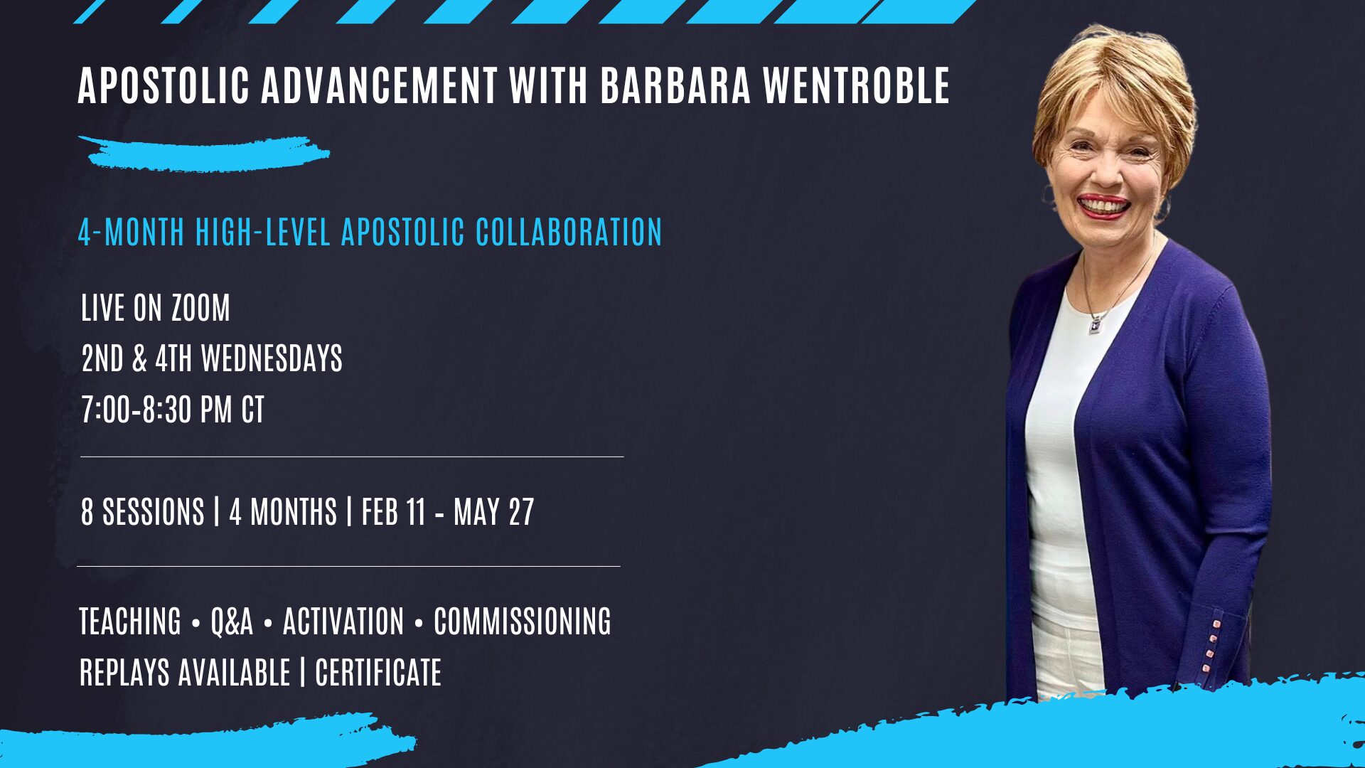 Apostolic Advancement is a 4-month, high-level apostolic collaboration on Zoom led by Barbara Wentroble for seasoned apostles, five-fold leaders, and ministry and marketplace leaders who govern, build, align, and advance the Kingdom. Leadership teams are encouraged to attend. Replays and PDF teaching notes are provided after every session.